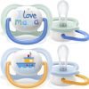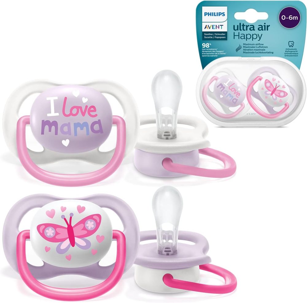 Philips Avent Ultra Air Pacifier, for 0-6m, Orthodontic & BPA-, 2 pcs, Including Sterilizer/Carrying Case, SCF080/02, Pink and Purple
